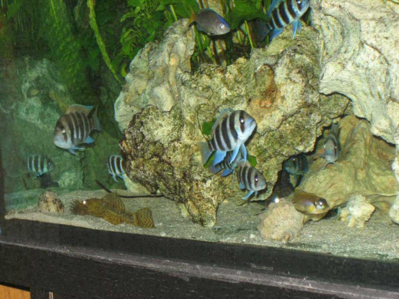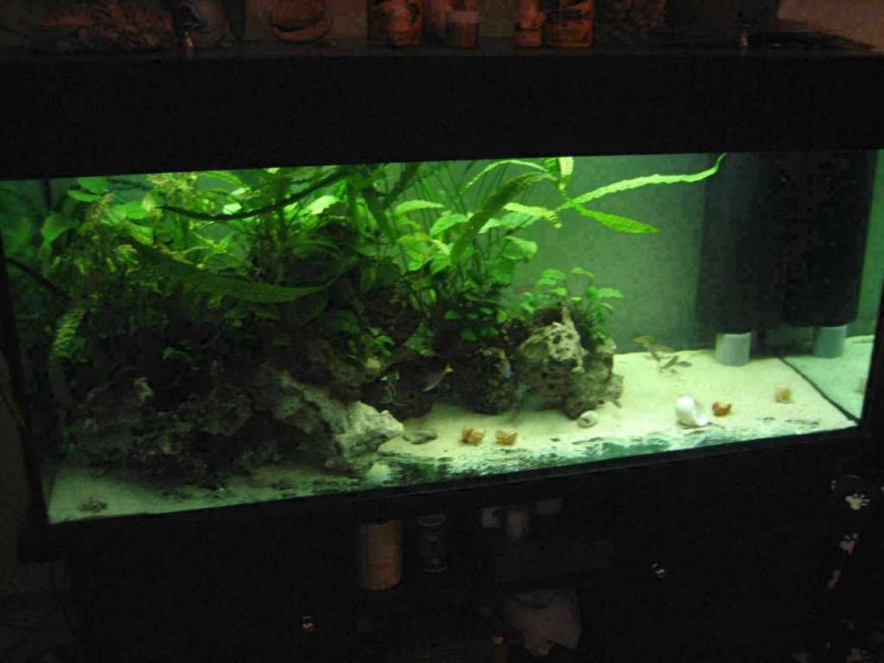 Das AQ steht nun mittlerweile schon seit 5 Jahren in unserer Wohnstube und wird gelegentlich neu gestaltet. Der Grund des "Sandmangels": Tanganjika - Cichliden graben gern das komplette AQ um und da wir solche "Sandgruben" nicht hübsch finden, stellen wir den Cichliden nur eine bodenbedeckte Sandschicht zur Verfügung.
