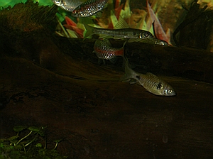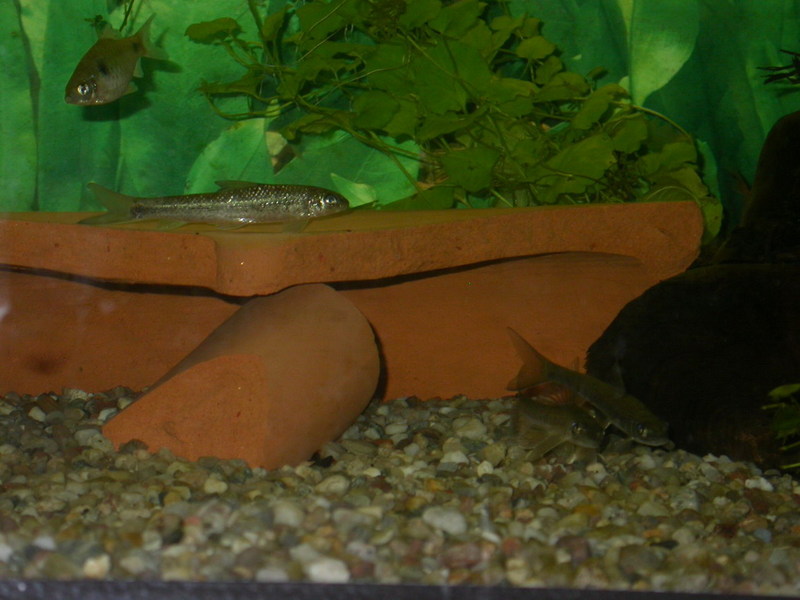 Dazu sind letzte Woche noch 7 Prachtschmerlen eingezogen. Von 3cm bis 7cm. Ein richtig schöner Schwarm. Diese verstecken sich gerne mal in den Wurzeln, oder in den Steinhölen. Als Futter konnte ich sie für Vipachips, lebende Mückenlarven und gefrohrene Muscheln begeistern.