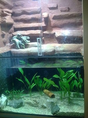 Der Obrige Bereich ist für Orchideen gedacht und in Arbeit,andere Landpflanzen werden dann ihre Nahrung aus dem Becken holen. Zur Zeit übe ich mich im Umgang mit Salzsäure und andere möglichkeiten um den PH Wert in den Griff zu bekommen, damit ich für die Orchis nicht extra Wasser machen muß.Meine Wasserwerte sind sehr niedrig nur nicht der PH.Da im Terra vorher Zwergwarane waren, ist das ganze nicht ganz einfach. Gruß Klaus ps. das Bild ist schon älter.