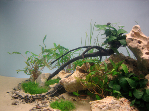 Einzelne Anubias und Cryptocorynen sollten Akzente setzen, während Vallisnerien und Aponogeton im Hintergrund für einen angemessen Grünanteil sorgen.