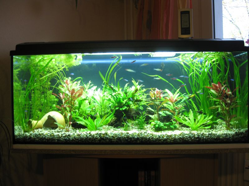 Zusätze wie Wasseraufbereiter, Pflanzendünger etc. habe ich von Anfang an vermieden. Bei mir kommt nur Wasser, CO2 und Futter ins Aquarium.