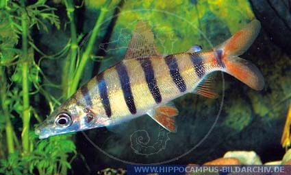 Obwohl man diesen herrlichen Fisch meist in silberner Farbe sieht gibt es auch eine rötliche Form. Trotz alledem sieht man die dunklen Querstreifen immer sehr gut.
